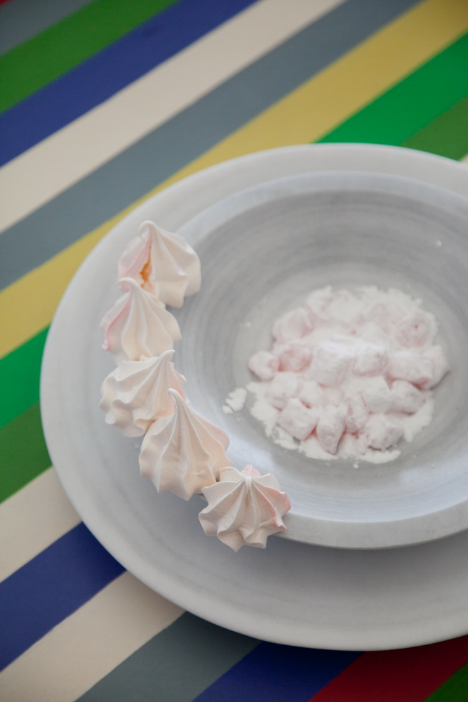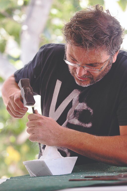 Η συνάντηση μεταξύ δύο δημιουργών είναι πάντα συναρπαστική. Πόσω μάλλον όταν γνωρίζονται από παιδιά, αλλά δεν έχουν ποτέ “συνομιλήσει” μέσα από τη δουλειά τους. Η μεγάλη πρόκληση για τον Πέτρο Μαρμαρινό είναι να δημιουργήσει νέες φόρμες και χρήσεις με ένα υλικό που φέρει την ιστορία και τη βαριά κληρονομιά του. Στα εξαιρετικά χρηστικά αντικείμενα που σχεδιάζει και που σμιλεύει με τον ίδιο πανάρχαιο τρόπο, ο παλιός κόσμος συνυπάρχει με τη μοντέρνα γλυπτική και τις νέες αισθητικές αναζητήσεις.