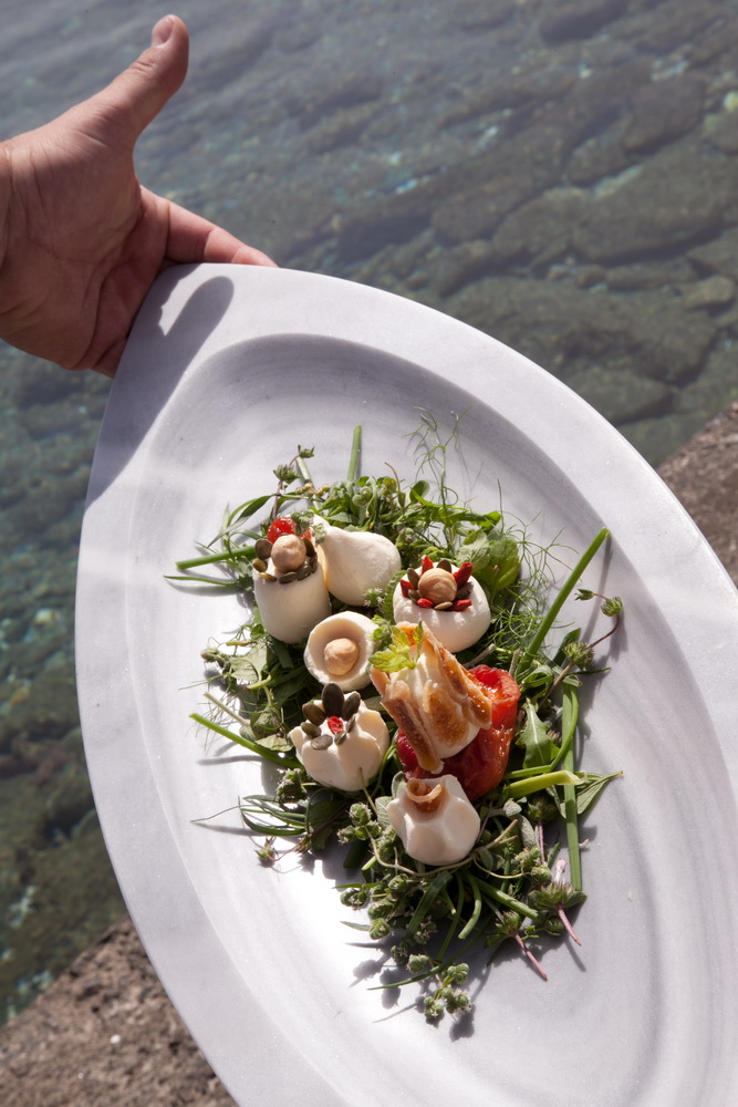 Τα “αρχαία” χρηστικά αντικείμενα του μαρμαρογλύπτη Πέτρου Μαρμαρινού ταξιδεύουν από τον Πύργο στη θάλασσα των Υστερνίων, και φιλοξενούν τις εφήμερες γαστριμαργικές δημιουργίες της μοναδικής Αντωνίας Ζάρπα.