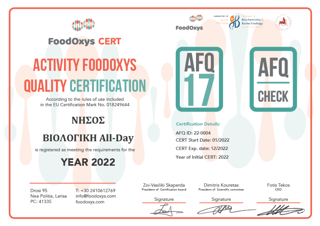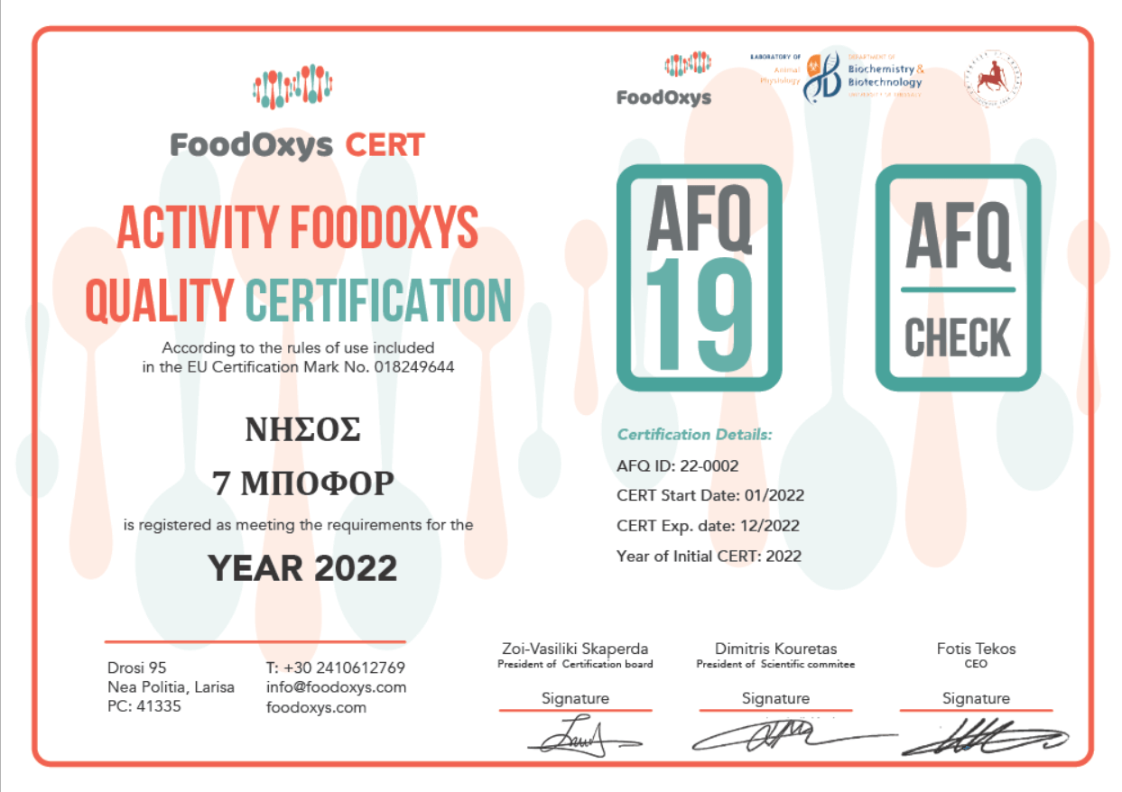 Το Ευρωπαϊκό Σήμα πιστοποίησης ποιότητας AFQ είναι ένα νέο πρωτοποριακό σύστημα βαθμολόγησης και κατάταξης της ποιότητας των αγροτικών προϊόντων και τροφίμων με βάση την βιοδραστικότητα της σύστασης τους σε σχέση με την ανθρώπινη υγεία και ευζωία.