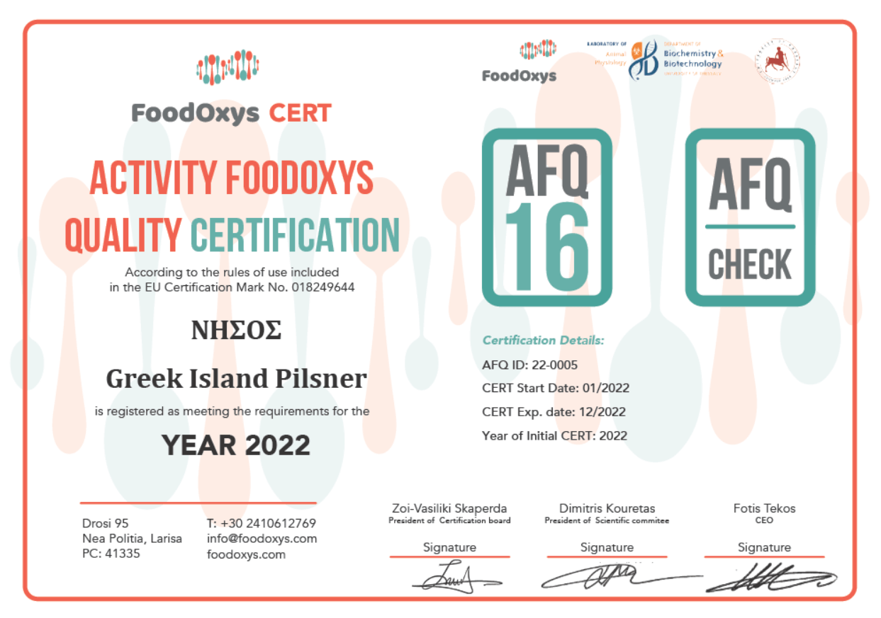 Πρώτες διεθνώς οι μπύρες ΝΗΣΟΣ λαμβάνουν το Ευρωπαϊκό Σήμα πιστοποίησης ποιότητας AFQ της FOODOXYS για την υψηλή βιοδραστικότητα της σύστασης τους προς όφελος της ανθρώπινης υγείας και ευεξίας